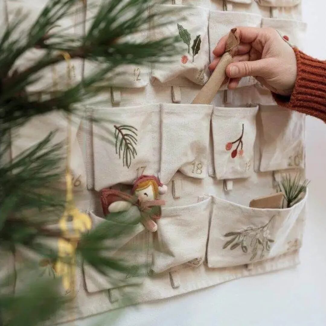 Fabelab(ファベラブ)の装飾的な壁掛けアドベントカレンダーは、季節の枝や葉、果実から着想を得たユールグリーンの美しい刺繍で飾られています。82cmの大きな壁掛けには24個のポケットが並び、小さなループ付きで毎日のサプライズを入れるのにぴったり。クリスマスまでの一日一日を、特別な時間として楽しむことができます。