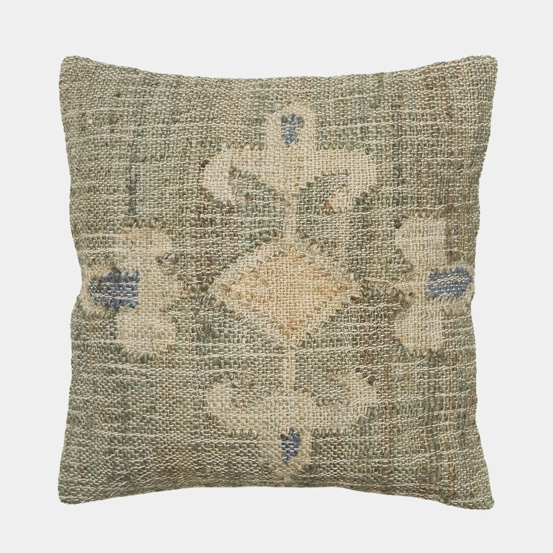 ナチュラルなマルチカラーの色合いとジュート織りのモチーフデザイン。裏面はナチュラルコットン仕上げ。(素材:ジュート/コットン)