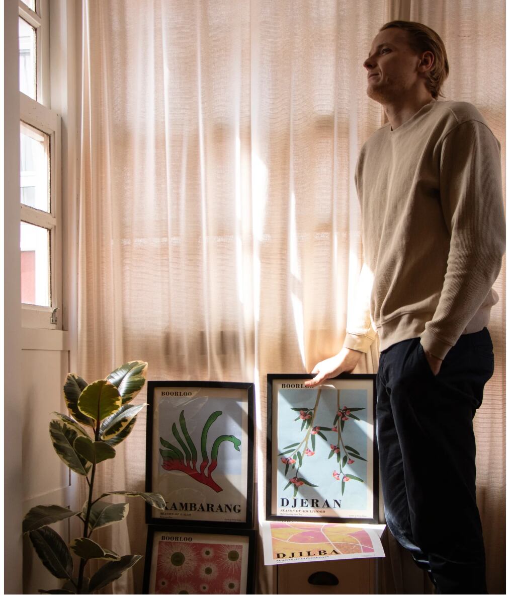 西オーストラリア州ブールルー(パース)で育ったジョシュアは、南西部に伝わるヌーンガーの6つの季節から着想を得ています。「ジルバ」は6部作のシリーズのひとつで、それぞれの季節に咲く在来種の植物を讃える作品です。