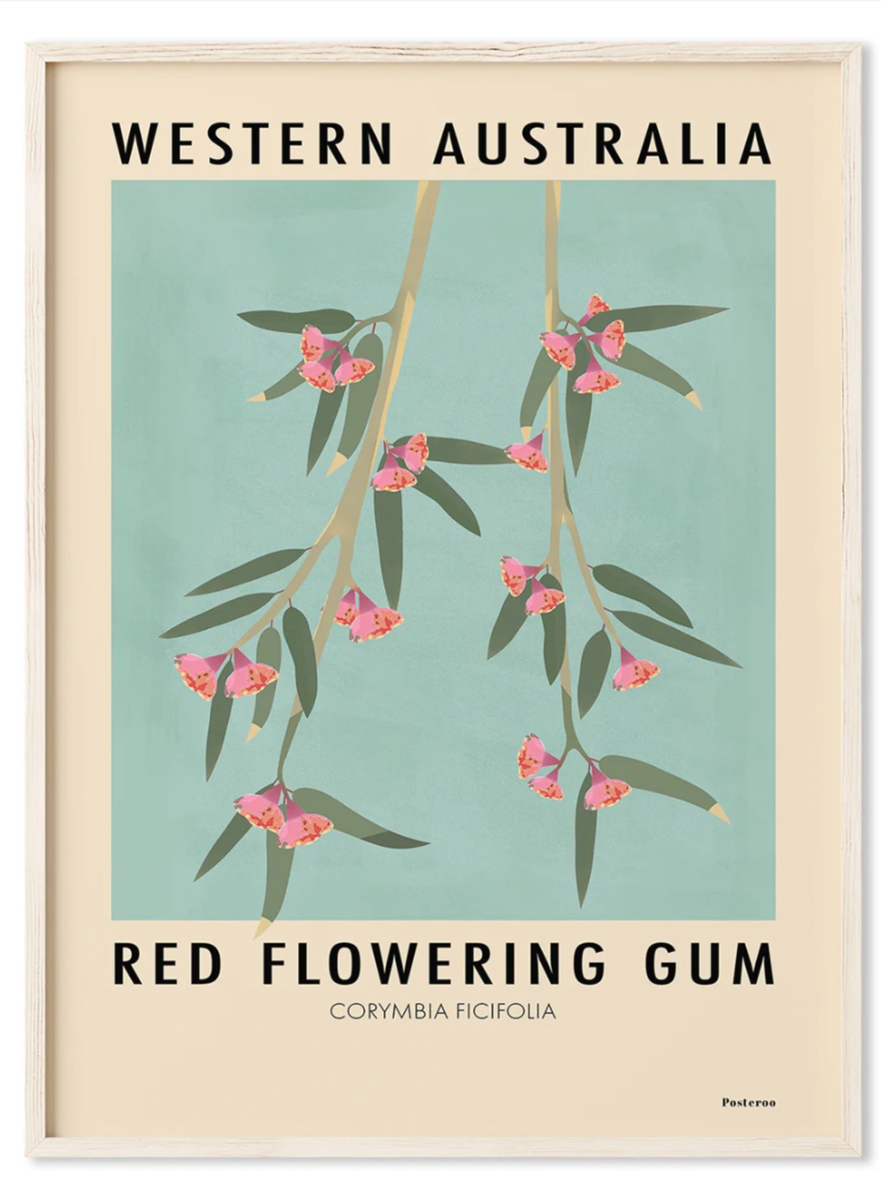 ジョシュア・カイルによる、赤い花を咲かせるユーカリ(Corymbia ficifolia)を描いたファインアートプリント。4月、秋の涼しい風が吹き始めると、鮮やかな赤い花がブッシュランドを彩り、ヌーンガー族の成人の季節「ジェラン」の訪れを告げます。