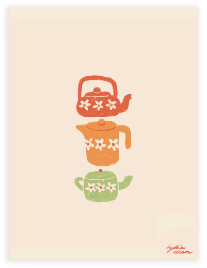 リディア・エレンによるアートポスターは、ティーポットの魅力を遊び心あふれるタッチで描いた作品です。オーストラリアにおける英国の影響や、大切に受け継がれてきたアフタヌーンティーの伝統を象徴し、精巧な描写のティーポットひとつひとつが、時代を超えた優雅さとティータイムの文化的意義を映し出しています。