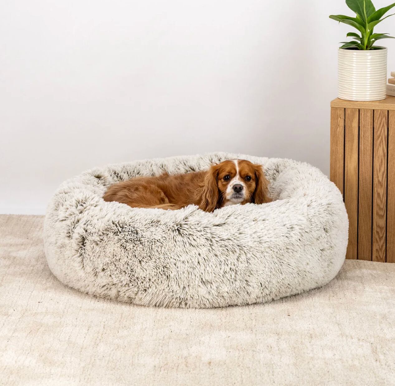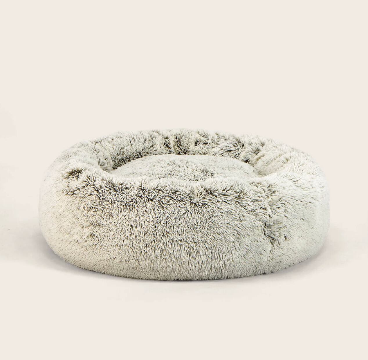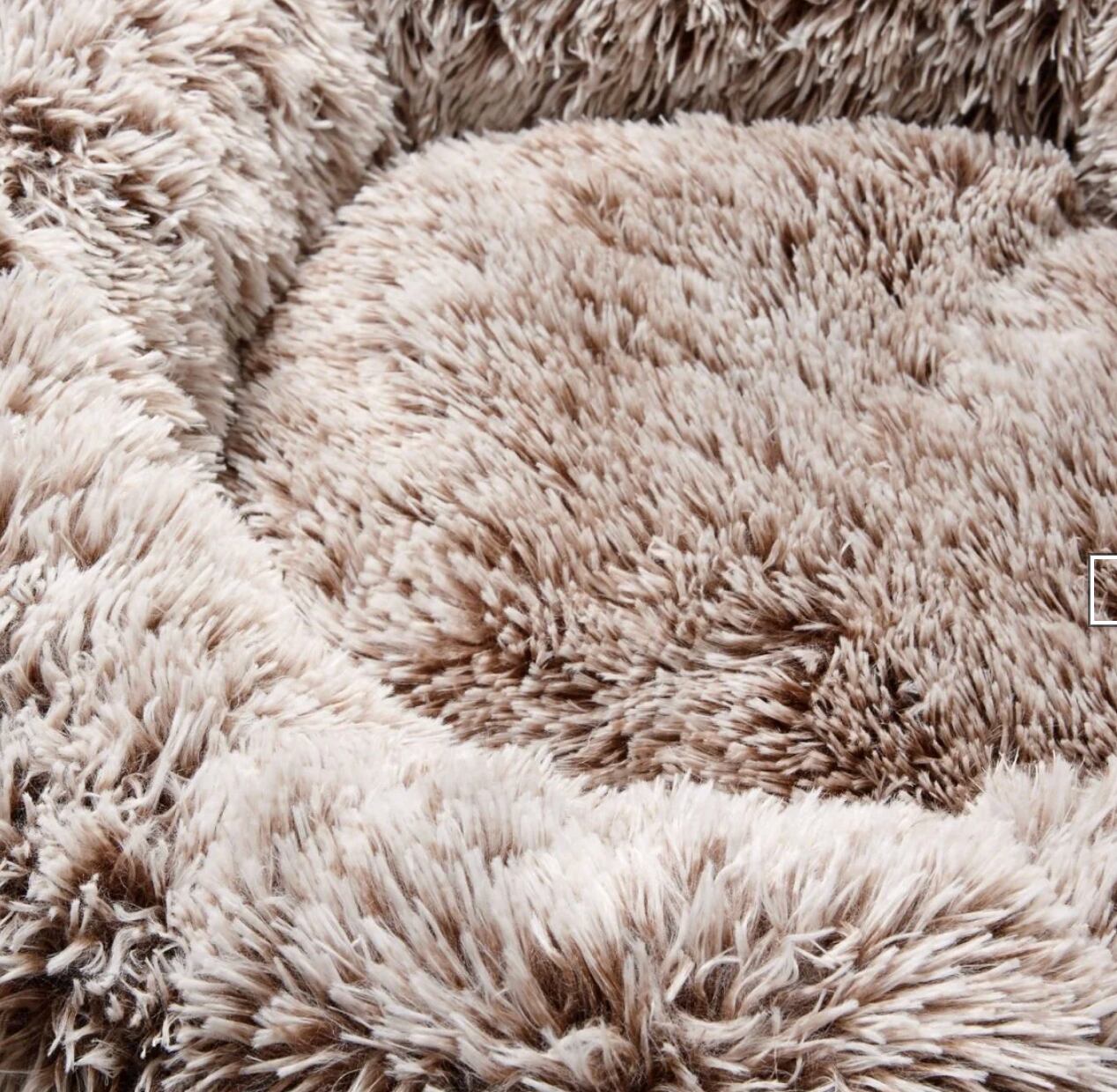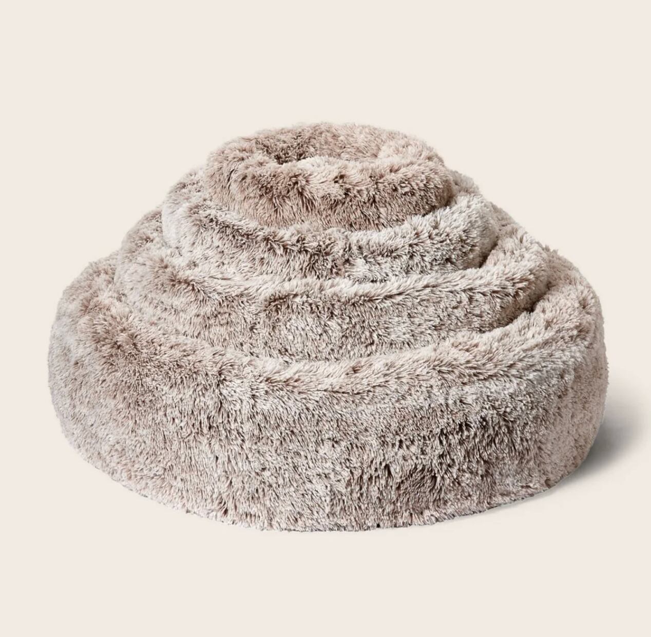 とても柔らかいロングパイルのヴィーガンフェイクファー、高めのふんわり壁、そして深めのスリープエリアが包み込むようにフィットし、まるで巣穴のような安心感をつくります。